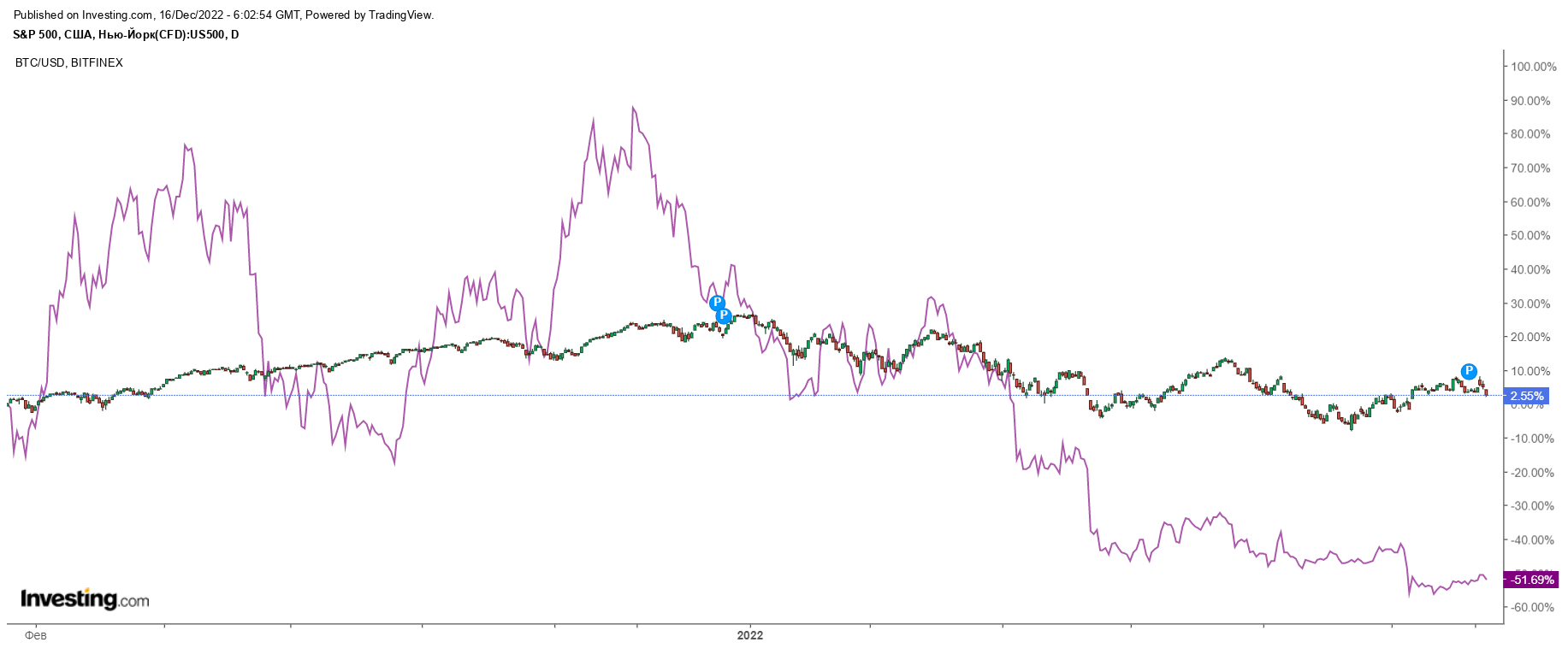 Аналитики считают, что фондовый рынок может вырасти в 2023 году в ответ на анти-инфляционную политику Центробанка. Например, на Уолл-Стрит видят потенциал движения S&P 500 к 5000 в течение 12 месяцев. Напомним, биткоин во многом повторяет динамику индекса.