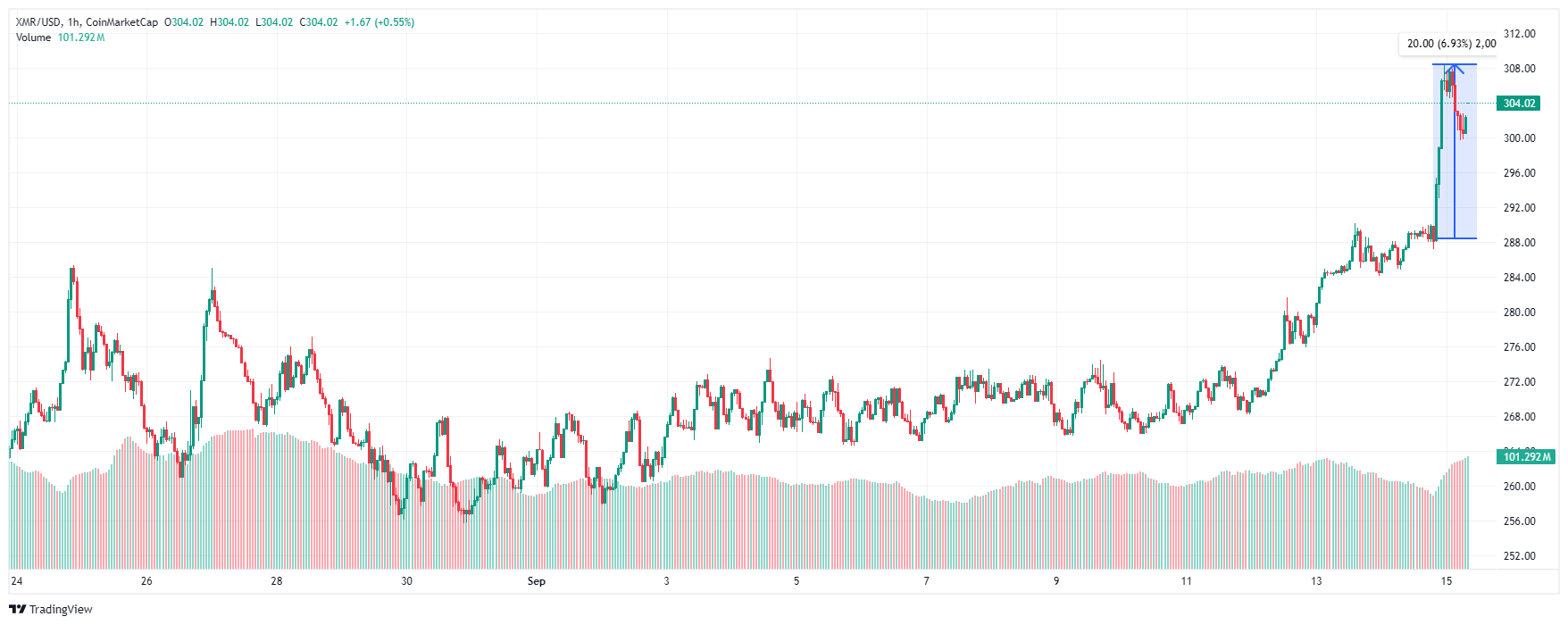 На фоне новости XMR в моменте подорожал почти на 7%, но после начался откат. На момент написания обзора, криптовалюта торгуется по $304, что на 41% дешевле максимума $517 от 2021 года.