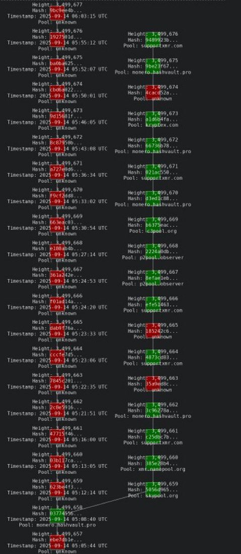 В сети продолжаются атаки скрытым майнингом. Майнеры намеренно задерживают публикацию блоков и выкладывают их партиями, заставляя сеть откатываться назад. За последние сутки, по наблюдениям разработчика Вини Барбоса, зафиксировано 213 потерянных блоков — почти треть от общего числа. Это подрывает стабильность работы сети и доверие инвесторов к Monero.
