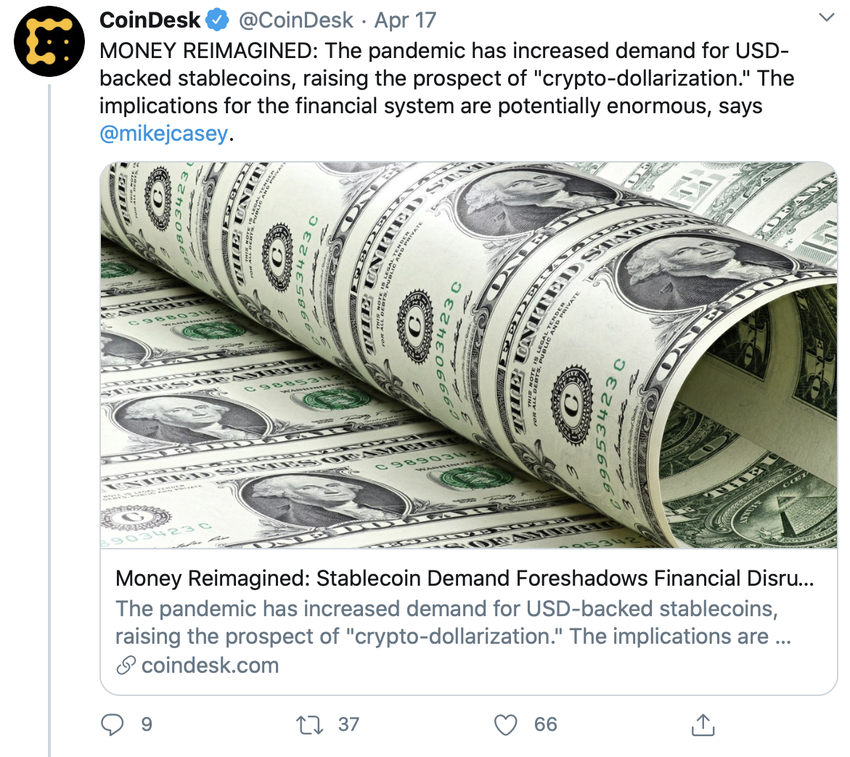 Недавно ресурс Coindesk предположил, что рынок вошел в новую стадию «криптодолларизации». Кризис, спровоцированный пандемией, обусловил рост спроса на стейблкоины, обеспеченные долларами США. Теоретически это может объяснить, почему Tether эксплуатирует сейчас свои печатные станки на пределе возможностей.
