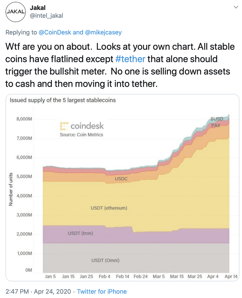 Однако под эту версию не получится подогнать многие факты. Так, например, пользователь Twitter Jakal (@intel_jakal) в этой связи обращает внимание на сравнительный график эмиссий стейблкоинов. В частности, его интересует, почему показатели всех остальных монет, за исключением Tether, остаются во флэте.