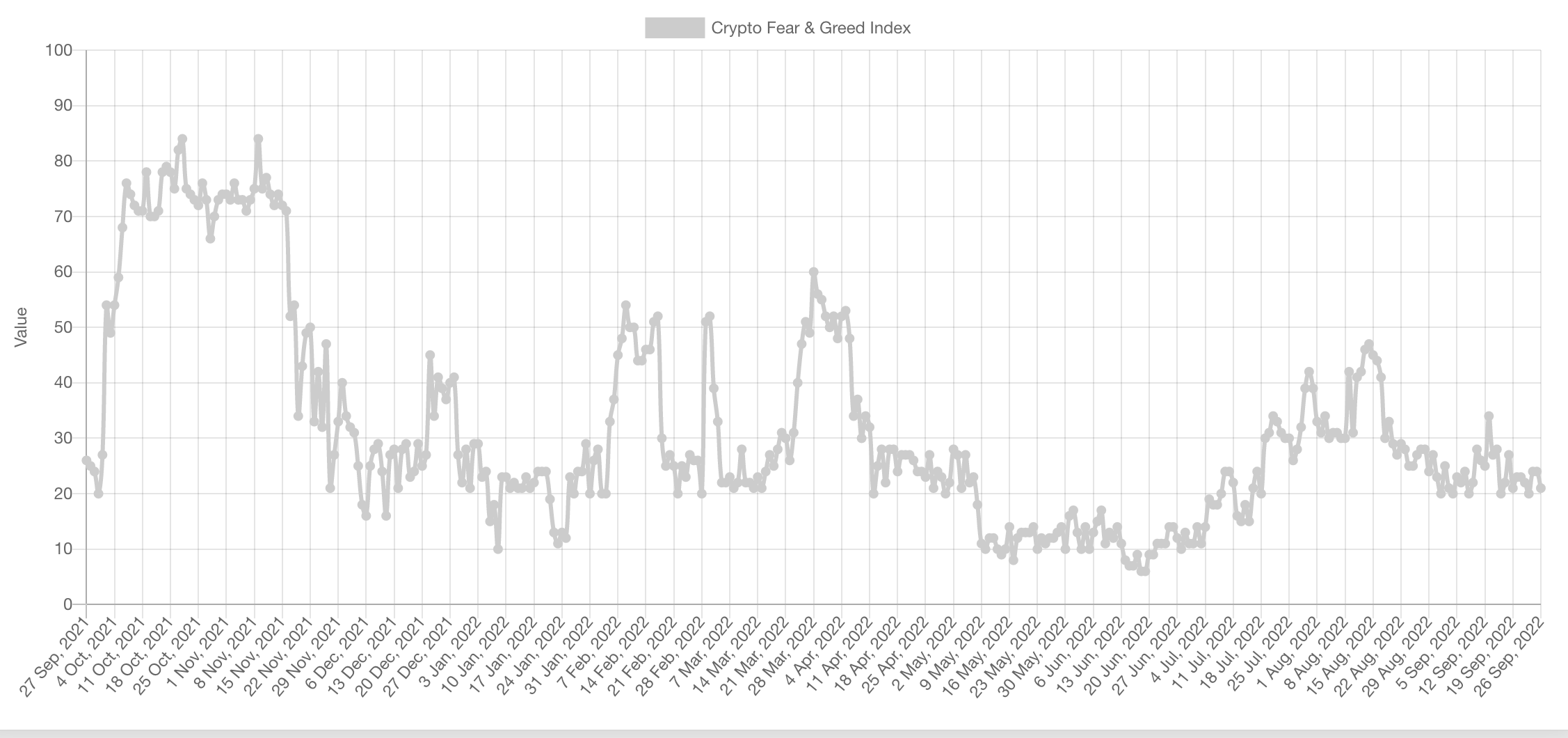 Индекс страха и жадности говорит о том, что настроения на рынке за месяц почти не изменились. Сейчас значение индекса — 21 из 100, что означает «экстремальный страх». В 2022 году оно не поднималось выше 60. Для сравнения: в 2021 году индекс достиг отметки 95 в феврале и 84 в октябре.