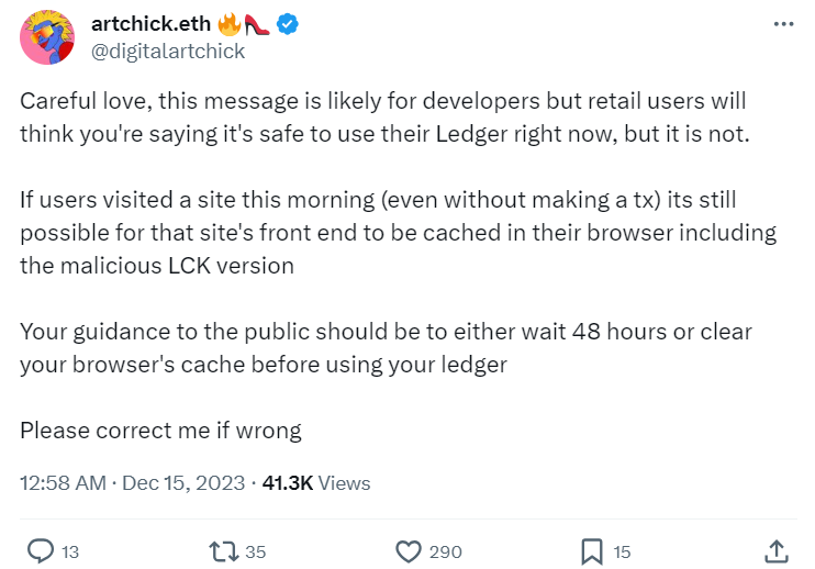 Пользователи Ledger усомнились в словах команды проекта о полной безопасности кошельков. Один из подписчиков обратил внимание на то, что вредоносный код мог остаться в кэше.
