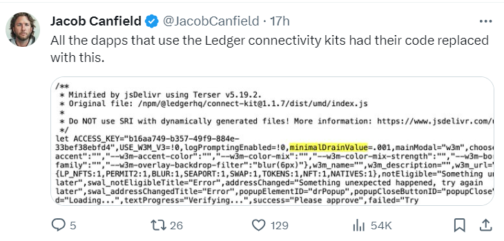 SponsoredОдним из первых на проблемы с безопасностью кошельков обратил внимание популярный в криптосообществе криптотрейдер Джейкоб Кэнфилд. В своем микроблоге он поделился фрагментом кода, который использовали мошенники для кражи денег владельцев Ledger через Ledger Connect.