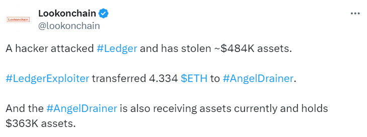 По данным Lookonchain, хакеру Ledger удалось украсть активы на $484 тыс.