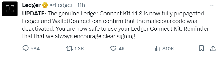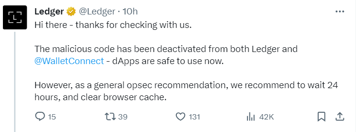 Представители Ledger утверждают, что проблема решена. При этом они просят пользователей воздержаться от работы с Ledger Connect в течение 24 часов.