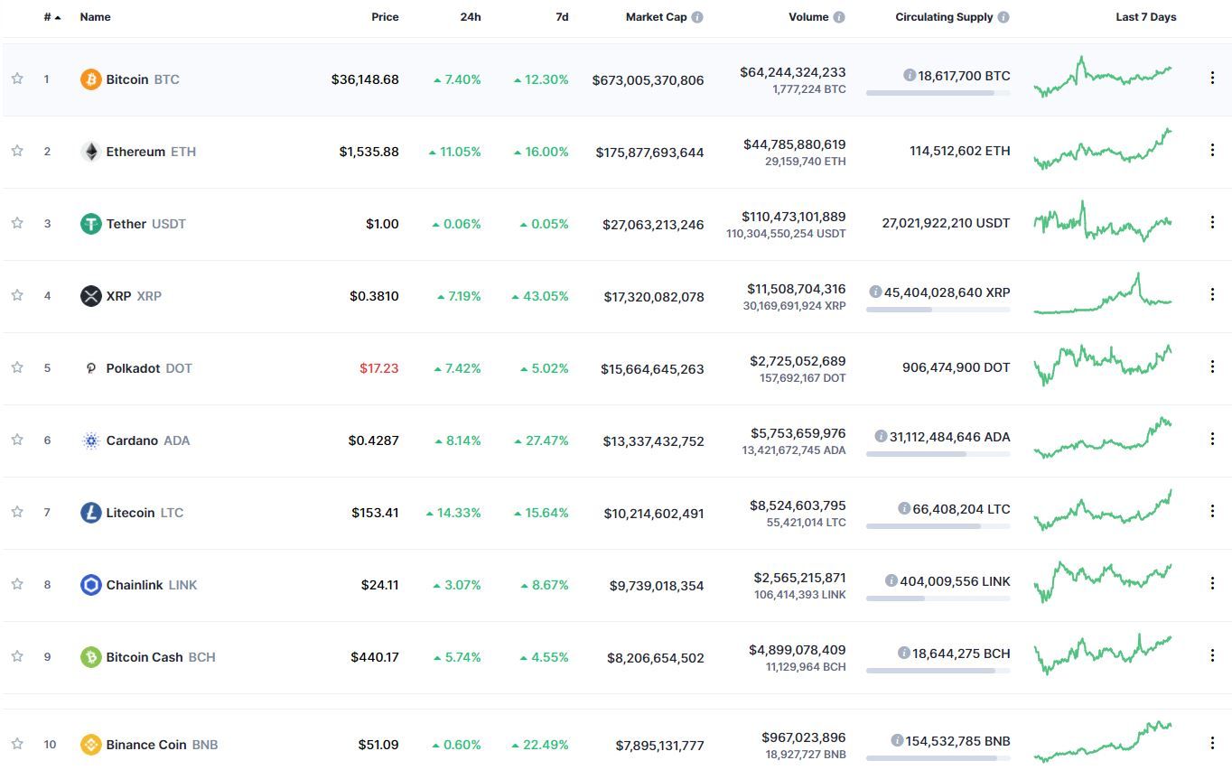 Среда началась с роста всех криптовалют из топ-10 рейтинга капитализации ресурса CoinMarketCap. Биткоин, по состоянию на 06:34 (МСК), торгуется по $36 148. За сутки криптовалюта подорожала на 7,40%, за неделю – на 12,30%.