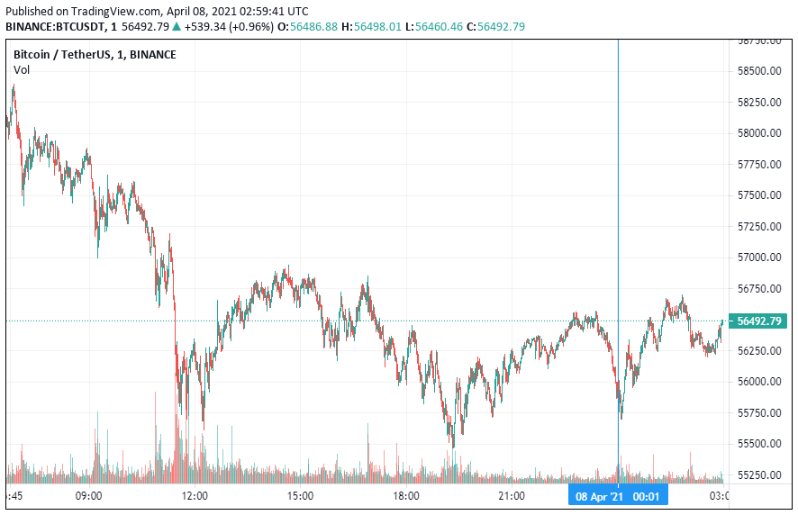 Самая капитализированная криптовалюта – биткоин – начала четверг с небольшого роста, которому предшествовало существенное падение. Еще вчера монета торговалась выше $58 тыс. На момент написания новости (06:01 по МСК), курс криптовалюты находится на высоте $56 617. За сутки биткоин потерял 1,85% стоимости.