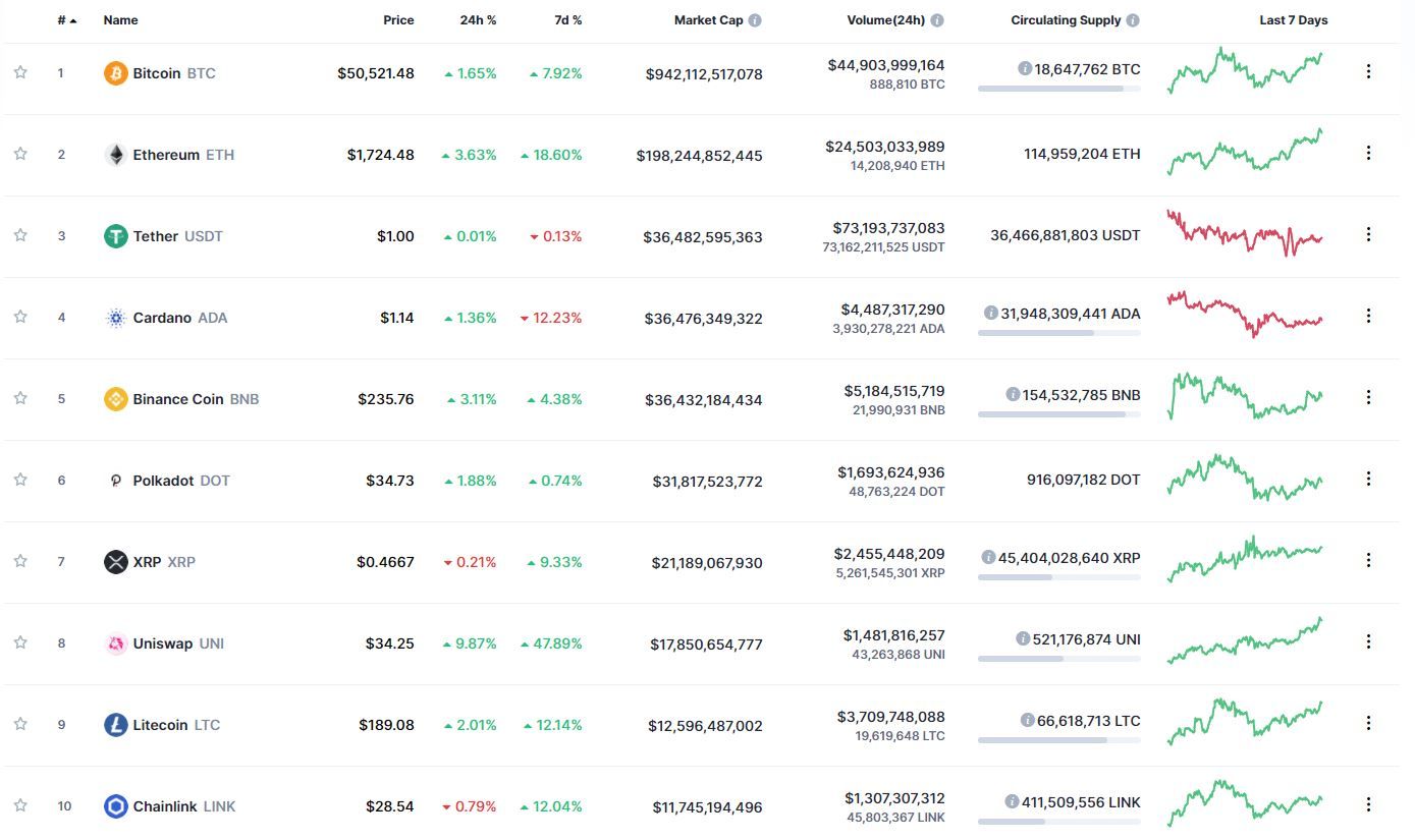 Все криптовалюты из топ-10 рейтинга капитализации ресурса CoinMarketCap, за исключением XRP и Chainlink, начали новую рабочую неделю с роста. Биткоин, по состоянию на 06:40 (МСК), торгуется по $50 521. За сутки криптовалюта подорожала на 1,65%, за неделю – на 7,92%.