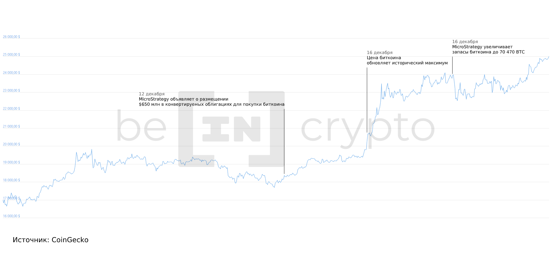 12 декабря MicroStrategy объявила об успешном размещении конвертируемых облигаций на сумму в $650 млн с целью покупки биткоина. Тогда же одна из крупнейших американских страховых компаний Massachusetts Mutual Life Insurance Co. заявила о покупке биткоина на сумму $100 млн.