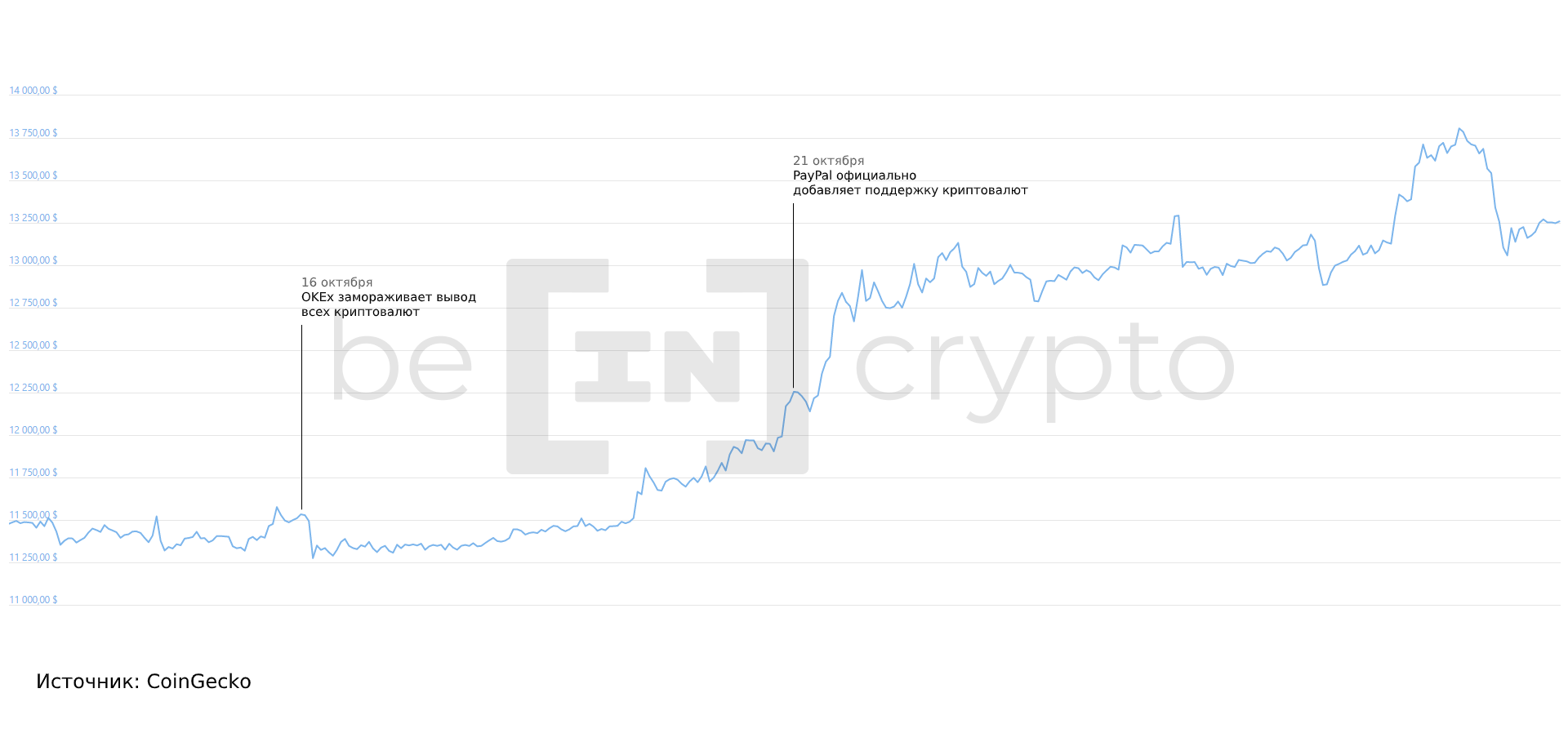 Биткоин при этом почти никак не отреагировал на новости, продолжая оставаться выше отметки $10 000.