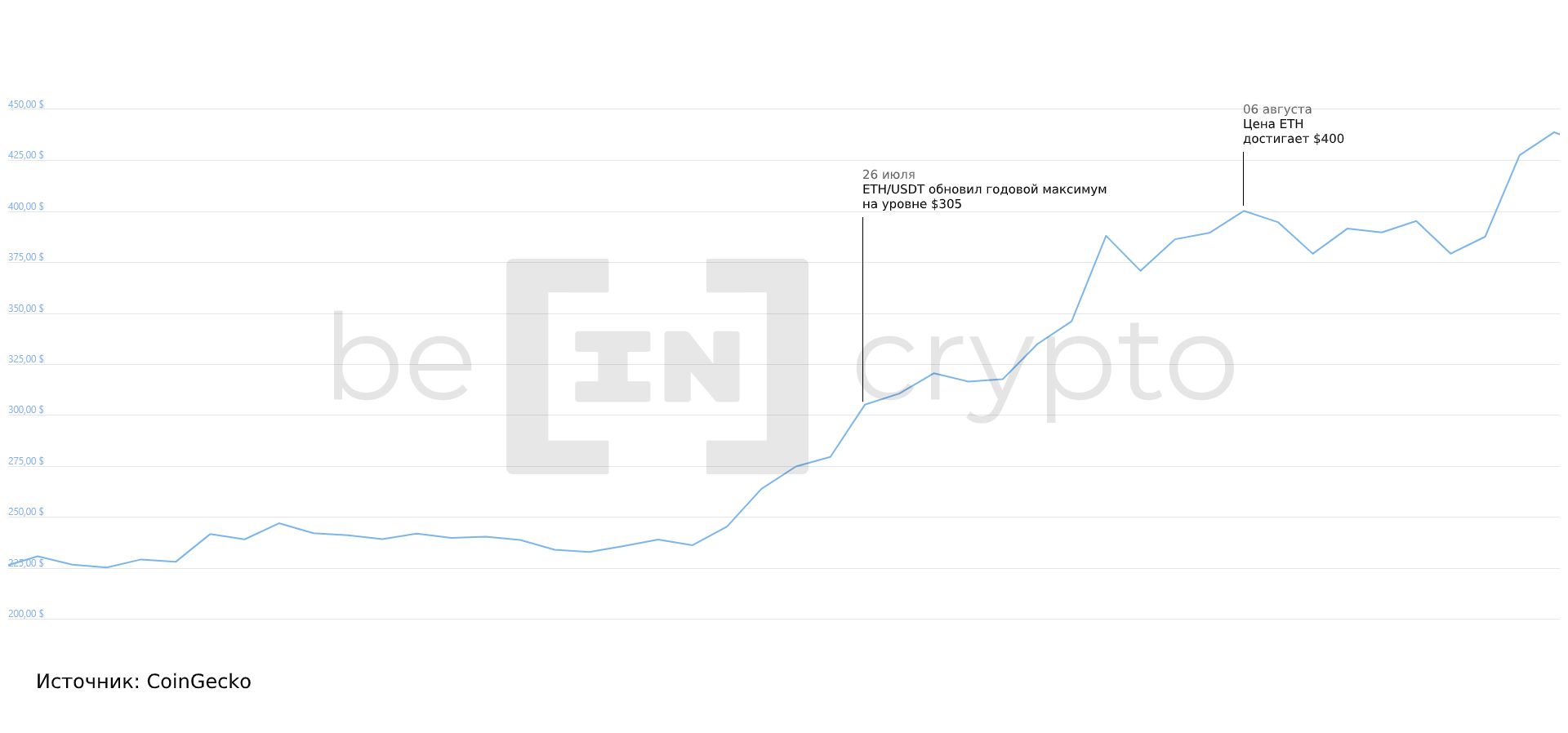 Несмотря на столь неоднозначное налоговое решение, в конце июля курс криптовалюты Ethereum в торговой паре ETH/USDT обновил годовой максимум на уровне в $305. В последний раз ETH был выше только в июне 2019 года, когда его курс достигал $360.