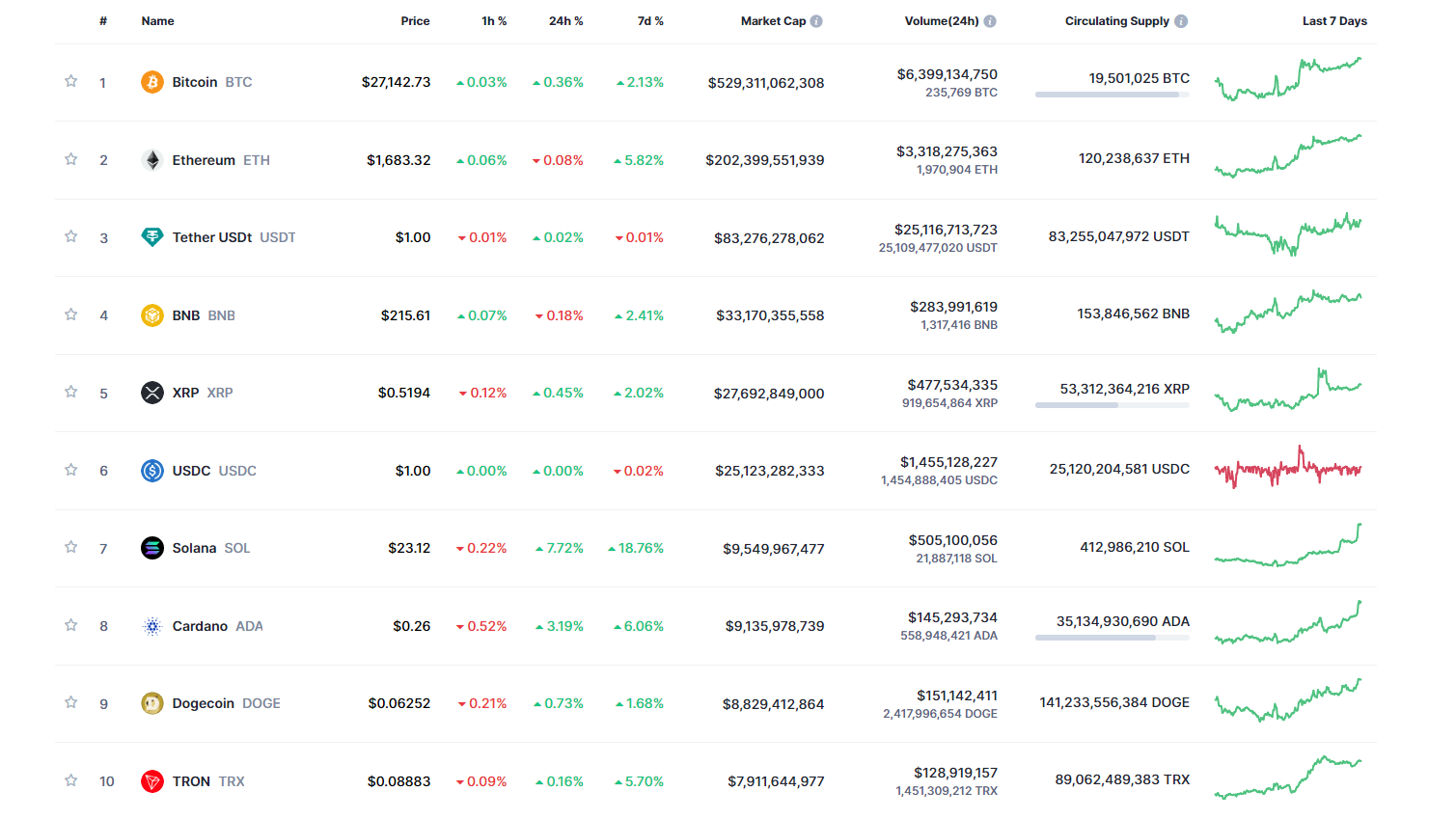 - Главная криптовалюта мира биткоин (BTC) завершает эту семидневку с внутринедельным повышением примерно на 2,1% в районе $27 142. В начале недели цена главной криптовалюты ненадолго опустилась к отметке $26 000, но после тестирования $26 000 BTC частично отыграл потери