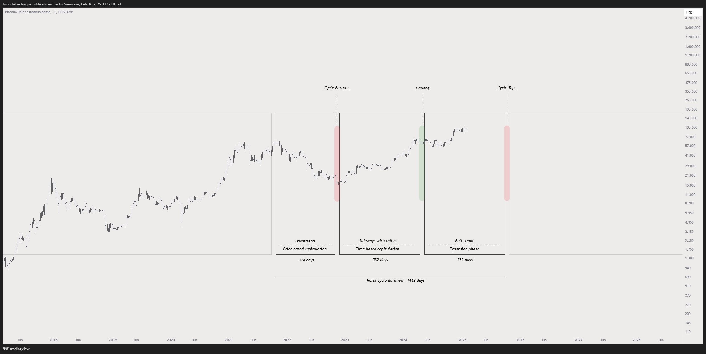 К оптимистам присоединился аналитик Inmortal. Он считает, что BTC установит циклический максимум ближе к октябрю этого года. Его прогноз биткоина построен на анализе поведения криптовалюты в предыдущих циклах после халвингов.