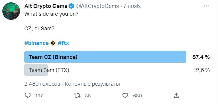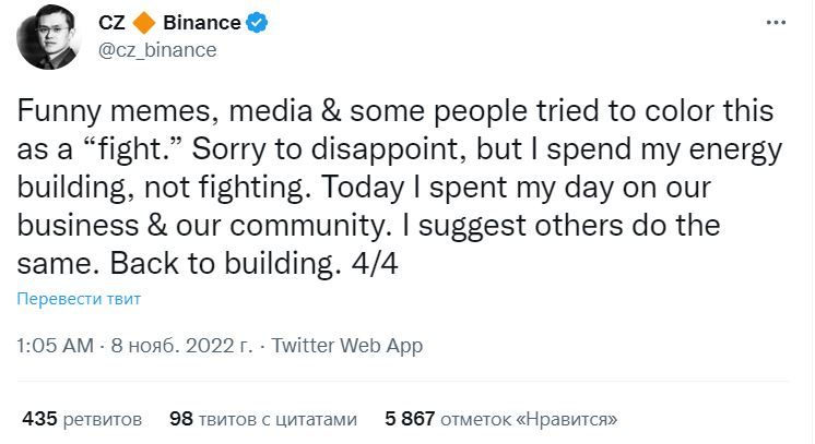 «Забавные мемы, медиа-ресурсы и некоторые люди пытаются выдать это [продажу FTT] за борьбу [между Binance и FTX]. Жаль разочаровывать, но я предпочитают направлять энергию на создание нового, а не на сражения», — написал Чанпэн Чжао в своем микроблоге.