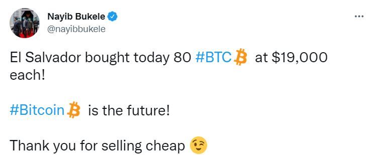 - Власти Сальвадора использовали падение биткоина для закупа криптовалюты. Об этом в своем микроблоге сообщил президент страны, Найиб Букеле. Политик рассказал о покупке 80 BTC по $19 тыс. и поблагодарил участников рынка за распродажу, благодаря которой ему удалось закупиться монетами, как он считает, по привлекательной цене.
