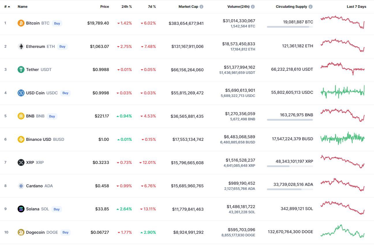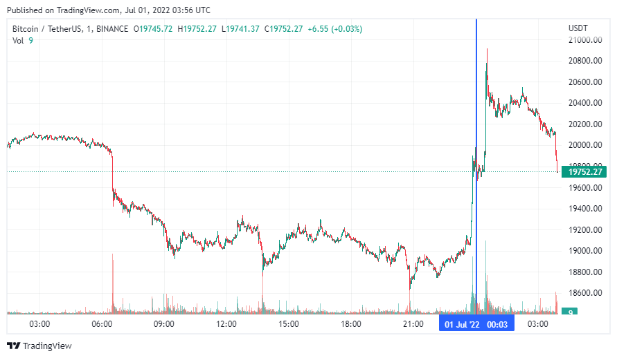 Биткоин (BTC), по данным ресурса CoinMarketCap, начал июль с роста. По состоянию на 06:56 (МСК), криптовалюта торгуется по $19 752. Минимум стоимости монеты за 24 часа зафиксирован на уровне $18 729, максиму – на высоте $20 632.