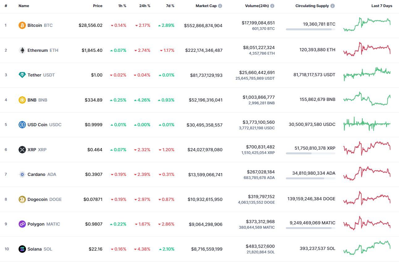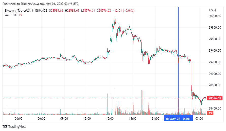 Биткоин (BTC), по данным ресурса CoinMarketCap, начал май с падения. По состоянию на 06:50 (МСК), криптовалюта торгуется по $28 576 (1 токен в рублях — ₽2,298,298). Минимум биткоина за 24 часа — $28 447, максимум — $29 952.