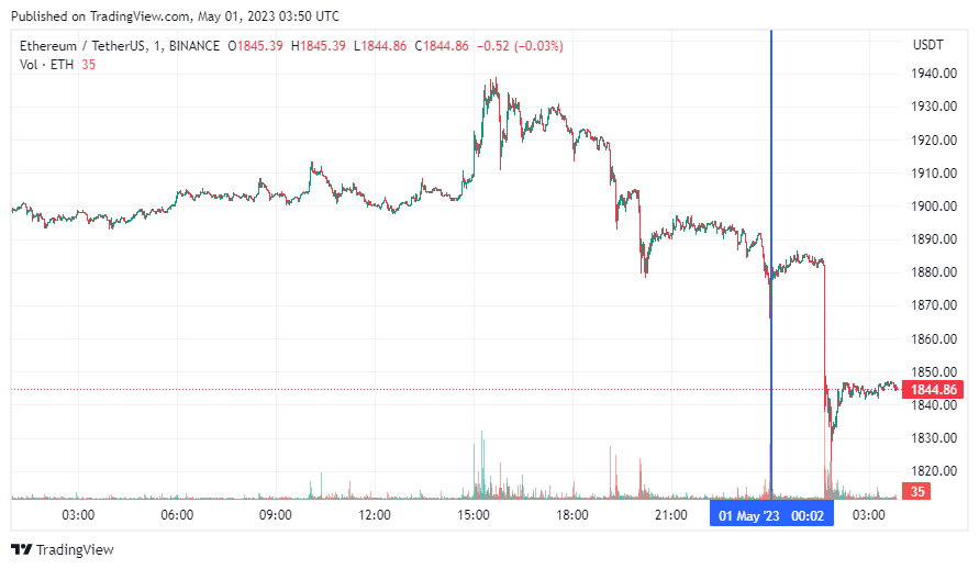 Вторая по капитализации криптовалюта Ethereum также начала день с падения. По состоянию на момент написания обзора, монета торгуется по $1844 (1 токен в рублях — ₽148,583).