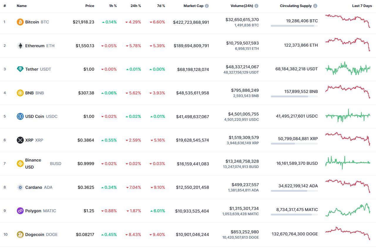 В топ-10 самых капитализированных криптовалют все монеты, за исключением ряда стейблкоинов, продемонстрировали отрицательную динамику. Наибольшие потери за 24 часа зафиксированы у Dogecoin (-8,43%). Также криптовалюта активнее других теряла в цене в рамках недели (-9,40%). Лучший результат за последние семь дней зафиксирован у Polygon (+6,01%).