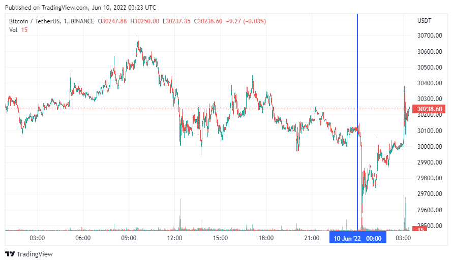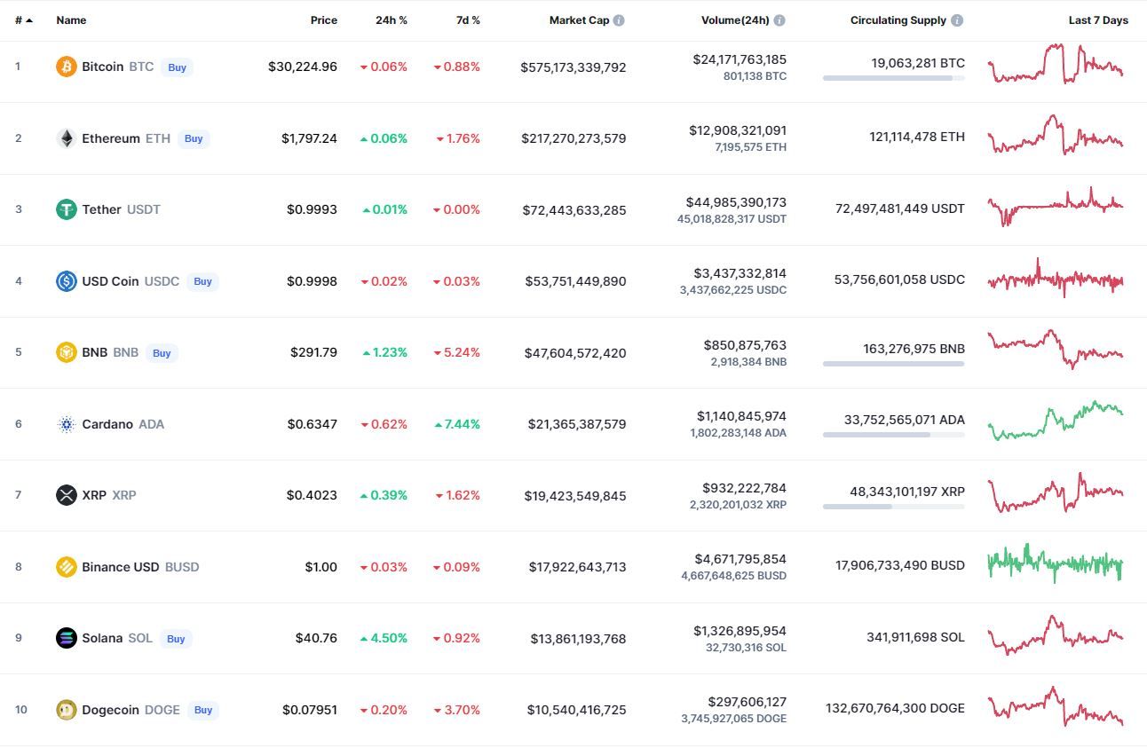 Биткоин (BTC), по данным ресурса CoinMarketCap, начал пятницу с небольшого падения, которое перешло в коррекцию. По состоянию на 06:24 (МСК) криптовалюта торгуется по $30 238. Минимум стоимости монеты за 24 часа зафиксирован на уровне $29 732, максимум – на высоте $30 609.
