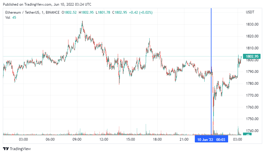 SponsoredВторая по капитализации криптовалюта Ethereum также начала день с падения, которое перешло в коррекцию. По состоянию на момент написания новости монета торгуется по $1802.