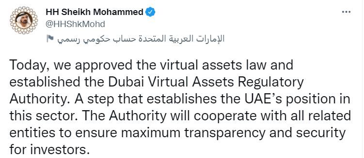 - В Дубае создадут агентство для регулирования виртуальных активов. Информация об этом появилась в микроблоге премьер-министра Объединенных Арабских Эмиратов Мохаммеда ибн Рашид Аль Мактума.