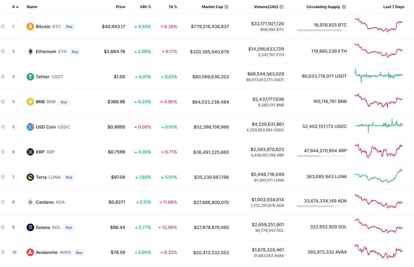 В топ-10 самых капитализированных криптовалют лучший результат за сутки (+7,82%) и неделю (+5,01%) зафиксирован у Terra. В рамках 24 часов все монеты, за исключением стейблкоина USD Coin, демонстрировали позитивную динамику движения. В течение недели активнее других теряла в цене Solana (-12,99%).
