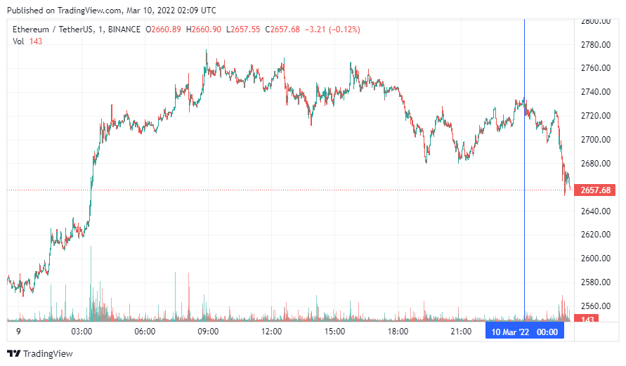 Вторая по капитализации криптовалюта Ethereum также начала день с падения. По состоянию на момент написания новости, монета торгуется по $2657.