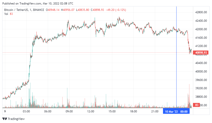 Биткоин (BTC) начал четверг с падения. По состоянию на 05:09 (МСК), криптовалюта торгуется по $40 898. Минимум стоимости монеты за 24 часа, по данным ресурса CoinMarketCap, зафиксирован на уровне $39 154, максимум – на высоте $42 465.