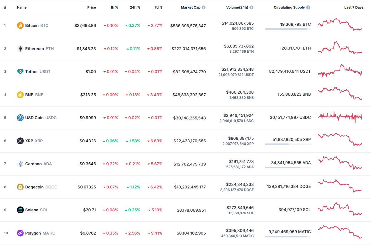 Биткоин (BTC), по данным ресурса CoinMarketCap, начал среду с бокового движения. По состоянию на 06:23 (МСК), криптовалюта торгуется по $27 685 (1 токен в рублях — ₽2,151,700). Минимум биткоина за 24 часа — $27 375, максимум — $27 824.