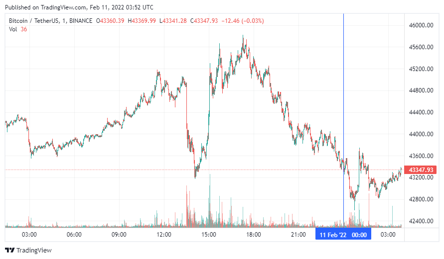 Биткоин (BTC) начал пятницу с падения, которое перешло в боковое движение. По состоянию на 06:53 (МСК), криптовалюта торгуется по $43 347. Минимум стоимости монеты за 24 часа, по данным ресурса CoinMarketCap, зафиксирован на уровне $42 864, максимум – на высоте $45 661.