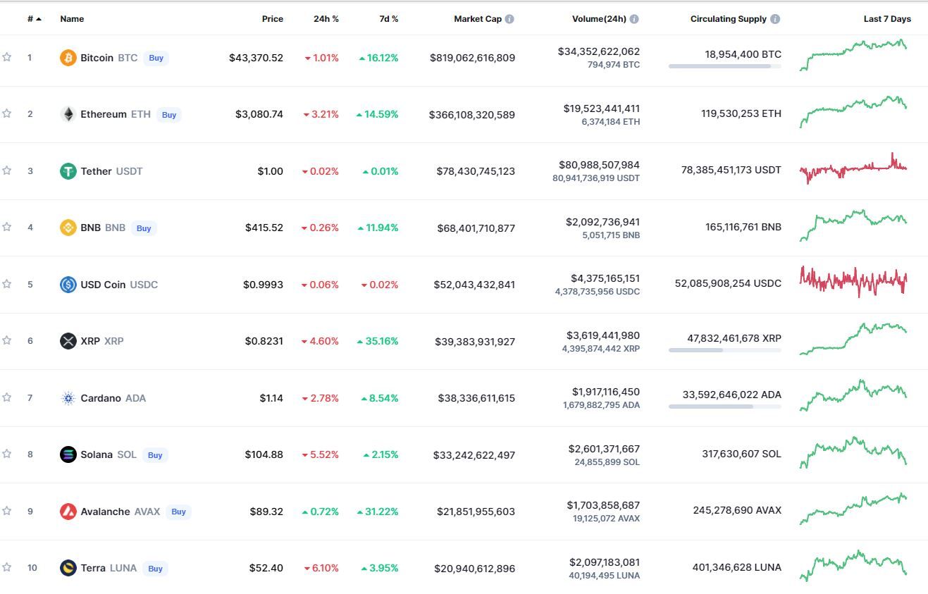 В топ-10 самых капитализированных криптовалют лучший результат за 24 часа зафиксирован у Avalanche (+0,72%). Активнее других монет в рамках недели рос XRP (+35,16%). Наибольшие потери в топ-10 криптовалют за 24 часа зафиксированы у Terra (-6,10%). В рамках недели все криптовалюты, за исключением стейблкоина USD Coin, продемонстрировали позитивную динамику движения.