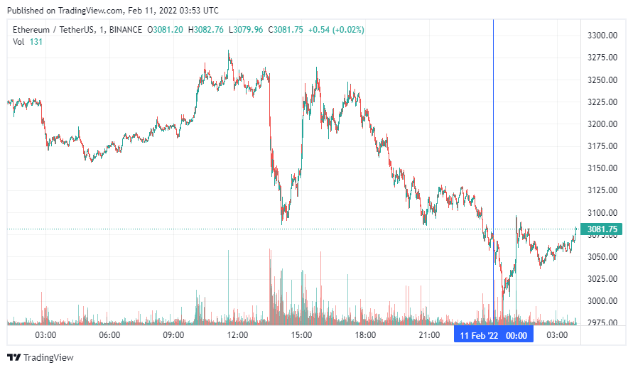 Вторая по капитализации криптовалюта Ethereum также начала день с падения, которое перешло в боковое движение. По состоянию на момент написания новости, монета торгуется по $3081.