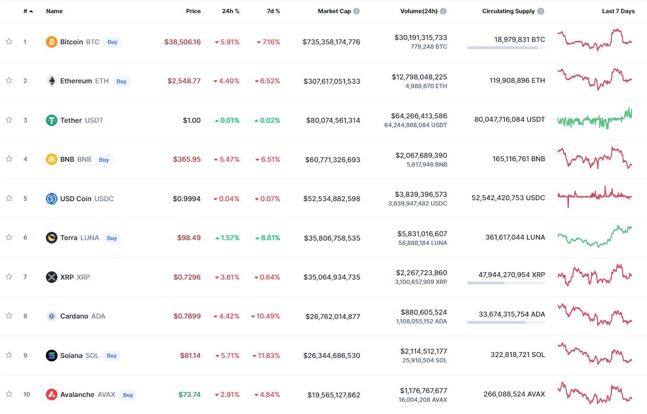 Sponsored SponsoredВ топ-10 самых капитализированных криптовалют наибольшие потери зафиксированы у биткоина (-5,91%). В течение недели активнее других терял в цене Solana (-11,83%). Лучший результат в топ-10 за 24 часа (+1,57%) и неделю (+8,81%) зафиксирован у Terra.