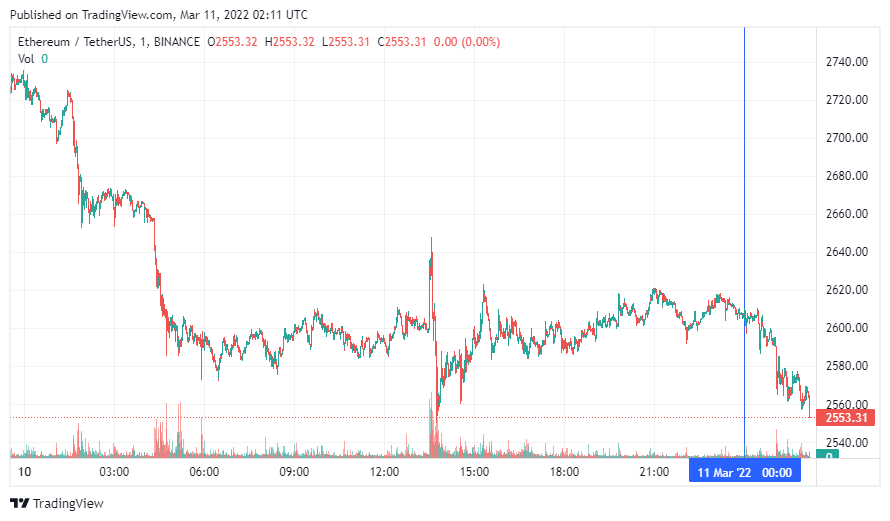 Вторая по капитализации криптовалюта Ethereum также начала день с падения. По состоянию на момент написания новости, монета торгуется по $2553.