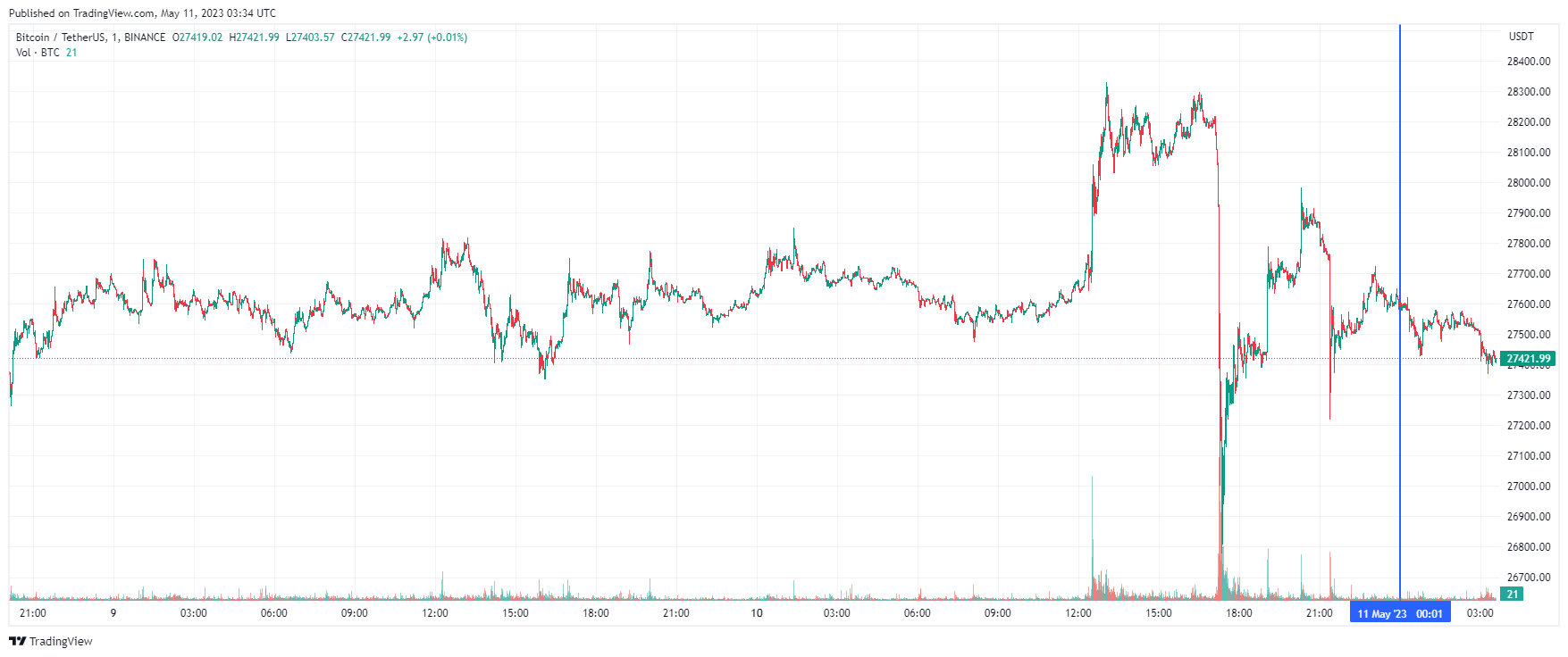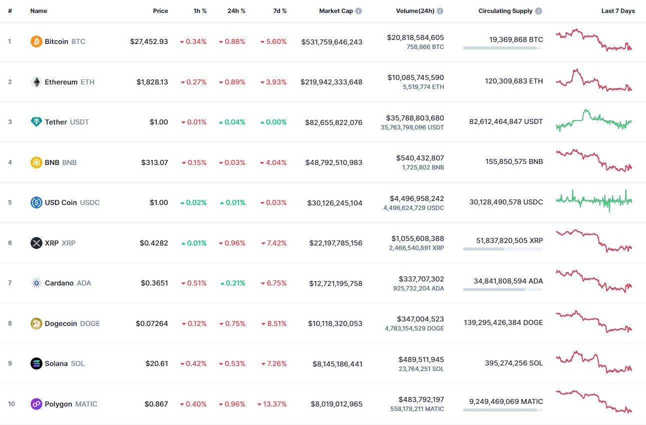 Биткоин (BTC), по данным ресурса CoinMarketCap, начал четверг с падения. По состоянию на 06:35 (МСК), криптовалюта торгуется по $27 421 (1 токен в рублях — ₽2,090,800). Минимум биткоина за 24 часа — $26 883, максимум — $28 322.