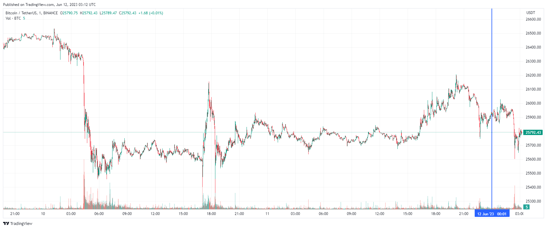 Биткоин (BTC), по данным ресурса CoinMarketCap, начал понедельник с падения. По состоянию на 06:13 (МСК), криптовалюта торгуется по $25 792 (1 токен в рублях — ₽2,136,368). Минимум биткоина за 24 часа — $25 668, максимум — $26 203.