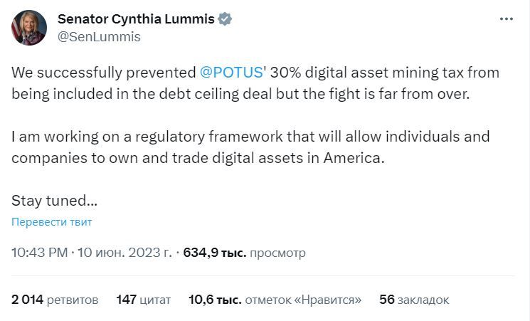 - Американский сенатор Синтия Ламмис разрабатывает нормативно-правовую базу, которая позволит отдельным лицам и компаниям владеть цифровыми активами и торговать ими в США. Информация об этом появилась в ее микроблоге.