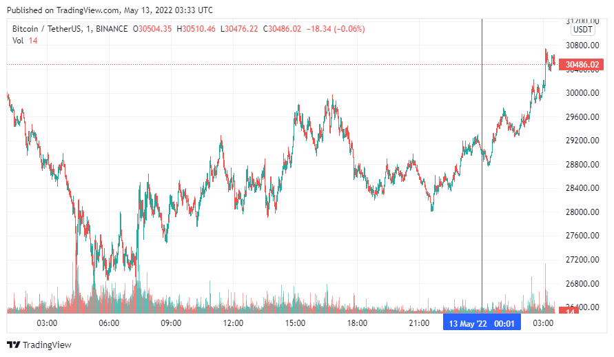 Биткоин (BTC) начал пятницу с небольшого роста. По состоянию на 06:33 (МСК), криптовалюта торгуется по $30 486. По данным ресурса CoinMarketCap, минимум стоимости монеты за 24 часа зафиксирован на $26 350, максимум – на высоте $30 524.