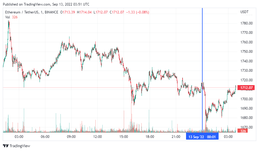 Вторая по капитализации криптовалюта Ethereum также начала день с небольшого падения. По состоянию на момент написания обзора, монета торгуется по $1712 (1 токен в рублях – ₽103,950).