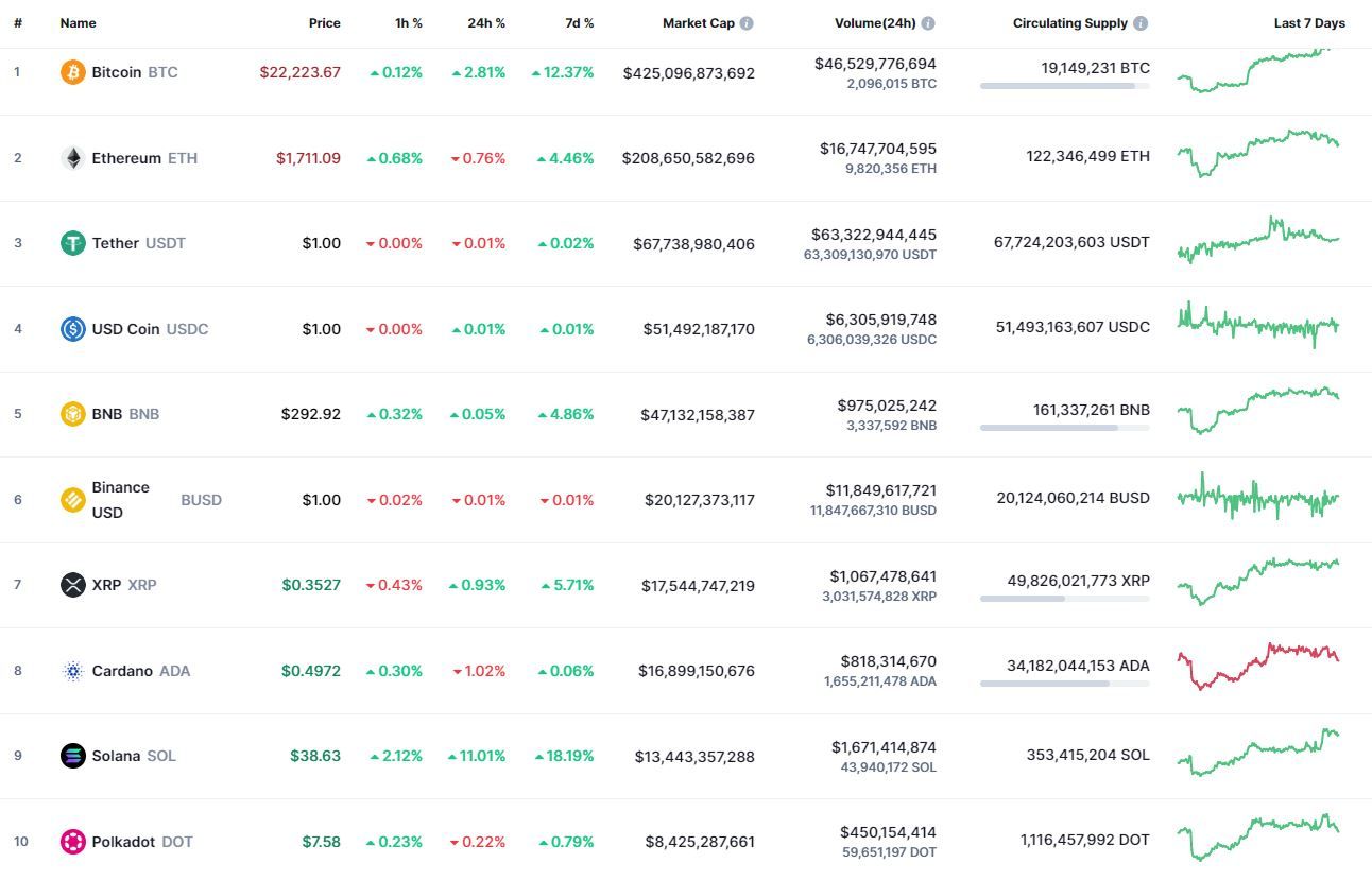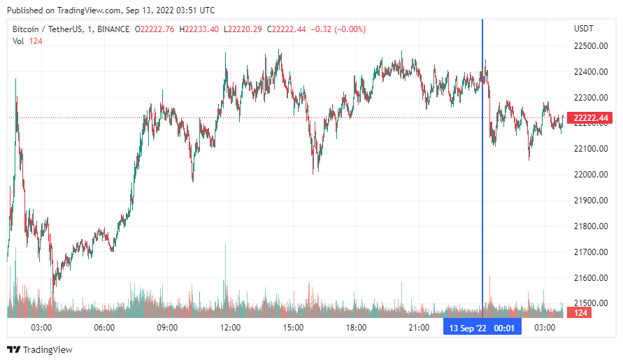 Биткоин (BTC), по данным ресурса CoinMarketCap, начал вторник с небольшого падения, которое перешло в боковик. По состоянию на 06:52 (МСК), криптовалюта торгуется по $22 222 (1 токен в рублях – ₽1,347,532). Минимум биткоина за 24 часа – $21 649, максимум – $22 439.