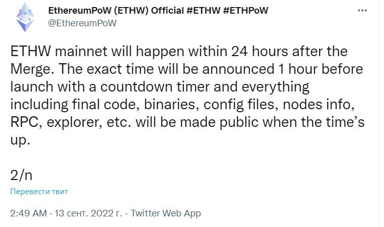 - Разработчики PoW-версии Ethereum – EthereumPoW (ETHW) обозначили время официального запуска основной сети проекта. По их словам, событие произойдет в течение 24 часов после переезда ETH с крайне энергозатратного PoW на более экологичный PoS-алгоритм в рамках обновления The Merge. Точное время участники криптосообщества узнают за час до запуска.