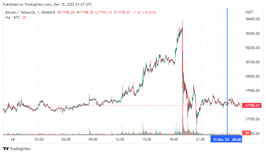 Биткоин (BTC), по данным ресурса CoinMarketCap, начал четверг с бокового движения. По состоянию на 04:28 (МСК), криптовалюта торгуется по $17 796 (1 токен в рублях – ₽1,152,957). Минимум биткоина за 24 часа – $17 739, максимум – $18 318.
