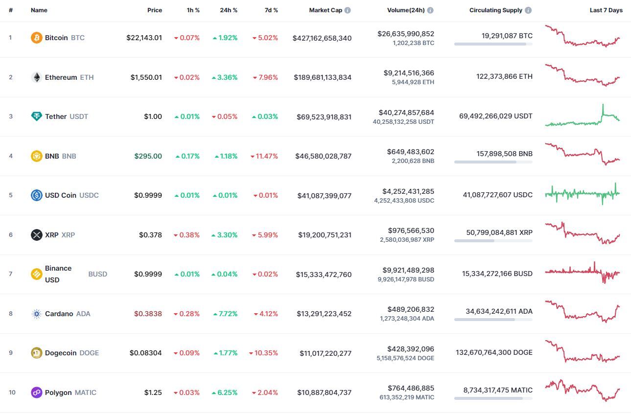 Биткоин (BTC), по данным ресурса CoinMarketCap, начал среду с небольшого снижения. По состоянию на 05:54 (МСК), криптовалюта торгуется по $22 116 (1 токен в рублях — ₽1,629,038). Минимум биткоина за 24 часа — $21 632, максимум — $22 293.