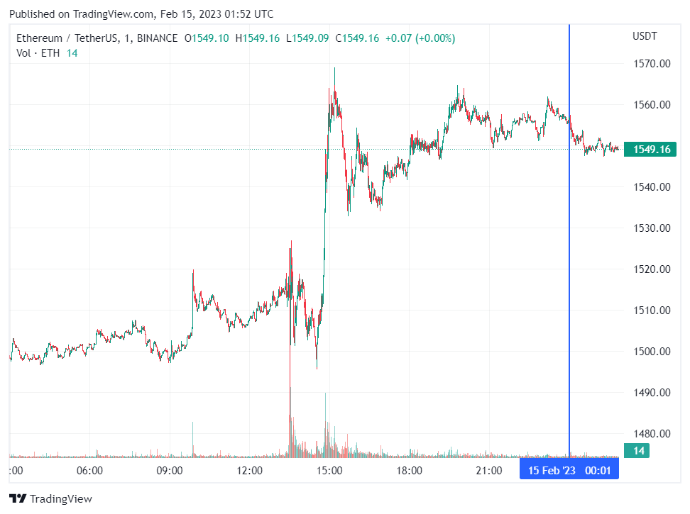 Вторая по капитализации криптовалюта Ethereum также начала день с небольшого снижения. По состоянию на момент написания обзора, монета торгуется по $1549 (1 токен в рублях — ₽114,039).