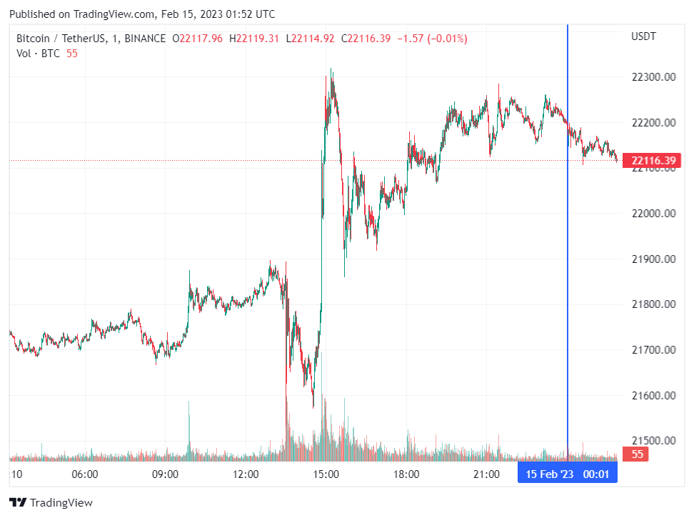 На фоне публикации свежих данных, S&P 500 в моменте вырос, но по итогам дня потерял 1.16 пункта. Рынок криптовалют, который повторяет за фондовым рынком, также вышел в рост. Максимум биткоина за 24 часа зафиксирован на уровне $22 293. После небольшого роста, рынок вышел в коррекцию. Напомним, на декабрьские данные США о снижении инфляции крипторынок отреагировал обновлением локальных максимумов.