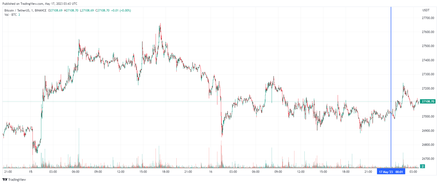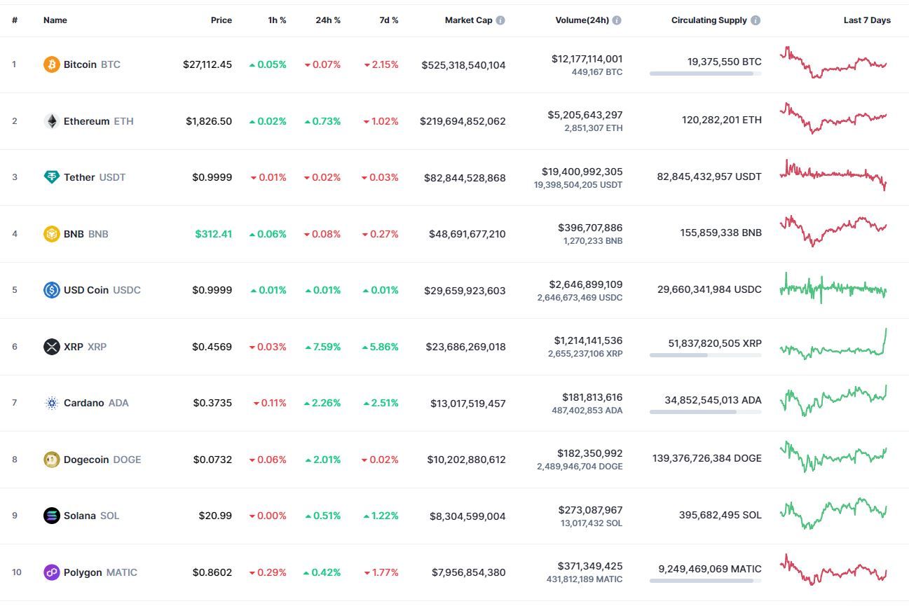 Биткоин (BTC), по данным ресурса CoinMarketCap, начал среду с небольшого роста. По состоянию на 06:43 (МСК), криптовалюта торгуется по $27 108 (1 токен в рублях — ₽2 182 173). Минимум биткоина за 24 часа — $26 910, максимум — $27 285.