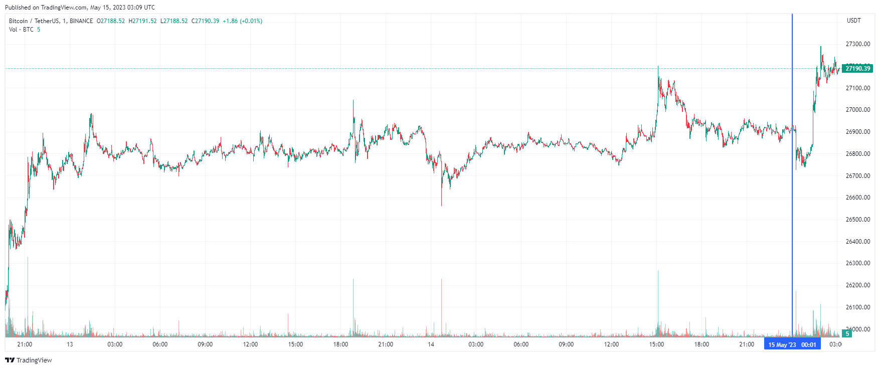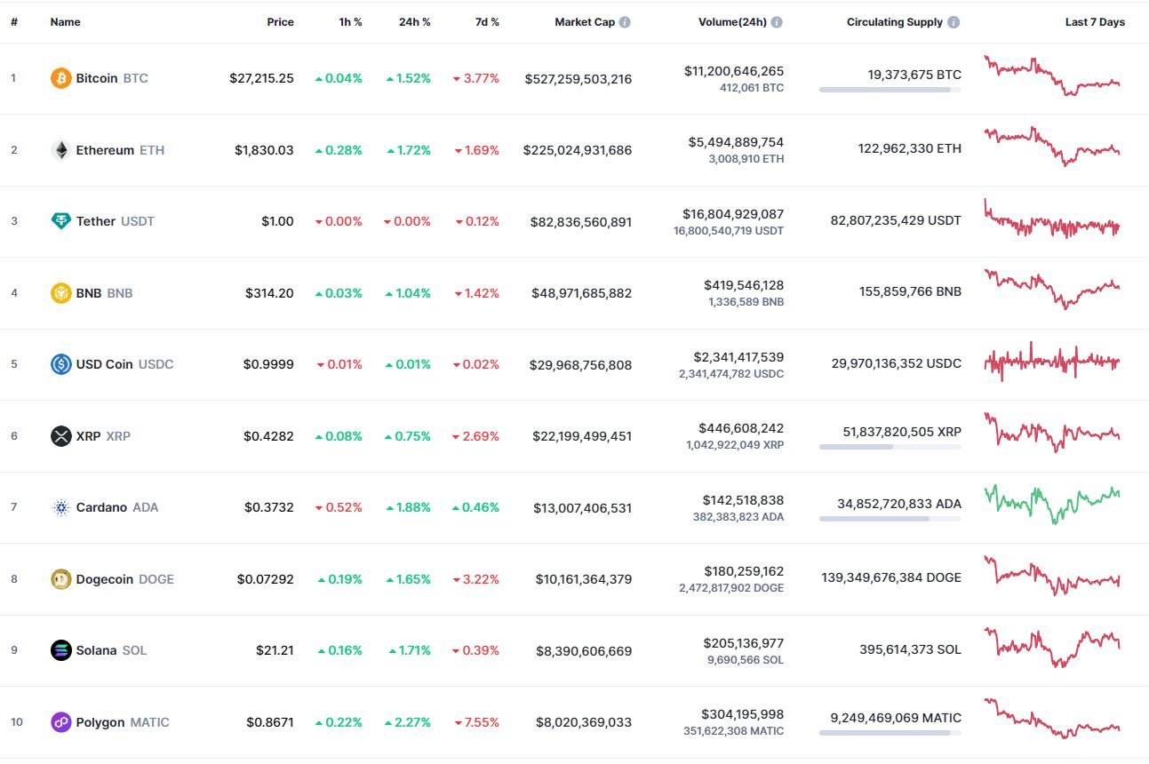 Биткоин (BTC), по данным ресурса CoinMarketCap, начал понедельник с небольшого роста. По состоянию на 06:10 (МСК), криптовалюта торгуется по $27 190 (1 токен в рублях — ₽2,114,031). Минимум биткоина за 24 часа — $26 762, максимум — $27 282.