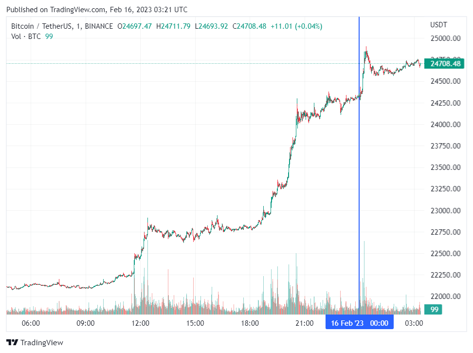 Биткоин (BTC), по данным ресурса CoinMarketCap, начал четверг со вспышки роста. По состоянию на 06:22 (МСК), криптовалюта торгуется по $24 708 (1 токен в рублях — ₽1,840,315). Минимум биткоина за 24 часа — $22 101, максимум — $24 769.